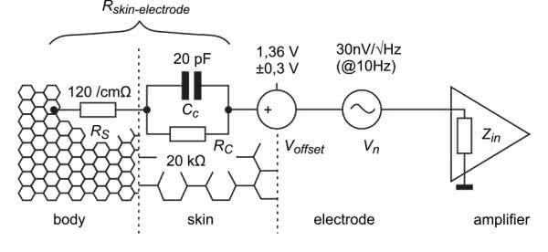 Istotnym czynnikiem wpływającym na wymagane parametry wejściowe układów pomiarowych jest charakter interfejsu elektroda-tkanka. W zdecydowanej większości badań nieinwazyjnych stosowane są elektrody typu Ag/AgCl wyposażone w dysk (zwany czasem czujnikiem), pokryty warstwą chlorku srebra oraz elektrolitem (najczęściej w postaci żelu), który kontaktuje się bezpośrednio ze skórą pacjenta (fotografia 1) [2]. Zadaniem takiego rodzaju elektrody jest konwersja prądów jonowych (typowych dla zjawisk fizjologicznych) na klasyczny (o nośnikach większościowych w postaci elektronów) sygnał napięciowy, możliwy do przetworzenia za pomocą wzmacniacza pomiarowego. Od momentu przyklejenia zespół przewodzący elektrody ulega stopniowej degradacji, z czasem zwiększając swoją impedancję, co ma bezpośredni wpływ na jakość rejestrowanych z powierzchni ciała sygnałów. Model elektryczny połączenia wzmacniacza pomiarowego z ciałem pacjenta został pokazany na rysunku 1.