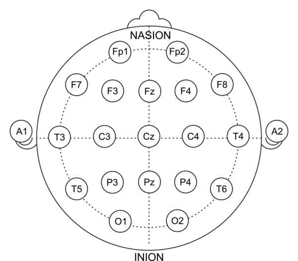 - Elektroencefalografia (EEG) – rejestracja elektrycznej aktywności kory mózgowej, prowadzona najczęściej w sposób nieinwazyjny, tj. za pomocą elektrod umieszczonych na powierzchni skóry głowy, zwykle według tzw. systemu 10–20 (rysunek 5). W celu zachowania właściwych proporcji pomiędzy odległościami dzielącymi poszczególne punkty pomiaru, elektrody umieszczane są w odpowiednio ukształtowanym, elastycznym czepku. Badanie wymaga jednoczesnego zapisu sygnałów z wielokrotnie większej liczby kanałów, niż w przypadku elektrokardiografii, co ma na celu zgrubne mapowanie aktywności poszczególnych ośrodków mózgu. Jednym z podstawowych problemów technicznych w rejestracji sygnałów elektroencefalograficznych jest niska amplituda sygnałów, wymuszająca stosowanie wzmacniaczy o relatywnie dużym wzmocnieniu. Przez kilkadziesiąt lat badań nad sygnałami elektroencefalograficznymi stosowanych było wiele technik analizy (w tym fourierowska analiza czasowo-częstotliwościowa, transformacja falkowa czy też analiza z użyciem sztucznych sieci neuronowych), jednak wysoce stochastyczny charakter tych zapisów (wynikający z sumowania sygnałów pochodzących od aktywności wielu milionów komórek nerwowych leżących w otoczeniu danej elektrody) sprawia, że badanie EEG dostarcza informacji o ograniczonej rozdzielczości przestrzennej, a w dodatku wymaga zastosowania podejścia statystycznego.