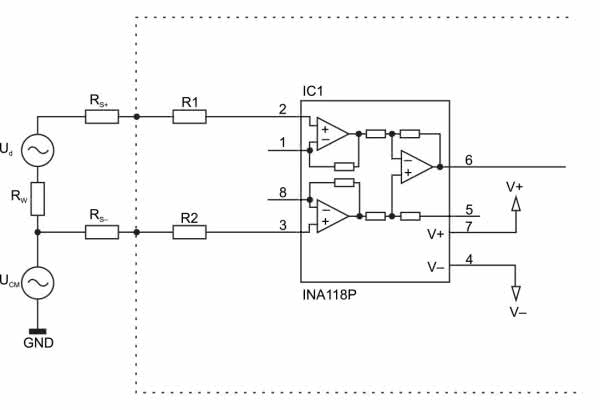2. Odporność na zakłócenia typu RFI rectification – wspólną cechą znakomitej większości wzmacniaczy pomiarowych jest wysoka wartość współczynnika CMRR, jednak tylko… przy niskich częstotliwościach. Producenci chwalą się wartościami rzędu 120 dB lub więcej, jednak podają tę liczbę zazwyczaj dla pasma z zakresu około podstawowej częstotliwości sieciowej. Im wyższa częstotliwość sygnału wspólnego, tym słabsze jego tłumienie przez obwody wzmacniacza. W zakresie od kilkudziesięciu kiloherców w górę układy typu INAMP praktycznie nie są w stanie poprawnie radzić sobie z wygłuszaniem niepożądanych napięć wejściowych.