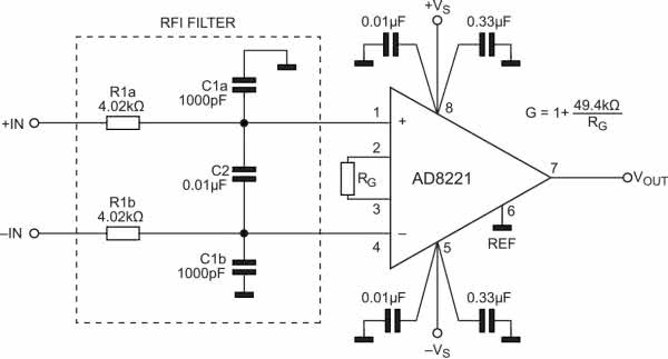 Sytuacja staje się szczególnie uciążliwa dla częstotliwości z zakresu radiowego. Obwody wejściowe wzmacniacza zaczynają bowiem pełnić rolę prostego demodulatora (detektora), który dodaje swój wkład do wejściowego napięcia niezrównoważenia. Producenci wzmacniaczy operacyjnych zalecają stosowanie zewnętrznych, dolnoprzepustowych filtrów RFI w klasycznej topologii, pozwalającej na tłumienie zarówno wspólnych, jak i różnicowych składowych zakłóceń radiowych (rysunek 7). Nowoczesne front-endy mają jednak wbudowane filtry RFI, które przynajmniej w pewnym stopniu redukują opisany problem. Nie zmienia to jednak faktu, że w aplikacjach klinicznych należy stosować solidną (choć nie nadmierną) filtrację dolnoprzepustową z użyciem właściwie zaprojektowanych filtrów dyskretnych.