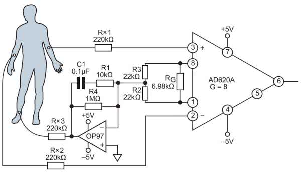 Jako przykład możemy podać pomiary wg odprowadzeń bipolarnych Einthovena – wejścia różnicowe wzmacniacza pomiarowego są co prawda podłączone do poszczególnych kończyn (np. górnych), ale… w układzie tym brakuje przecież podłączenia do masy układu! W systemach EKG, EEG czy EMG nie stosujemy jednak podłączenia dodatkowej elektrody bezpośrednio do masy. Zamiast tego powszechnie stosuje się dodatkowy wzmacniacz operacyjny, który podaje na tę trzecią elektrodę odwrócony (tj. w przeciwfazie) sygnał wspólny, przez co zakłócenia wspólne ulegają znacznej redukcji i to bez stosowania jakiejkolwiek agresywnej filtracji w dziedzinie częstotliwości. Popularną techniką pozyskania takiego sygnału jest pobranie napięcia ze środkowego odczepu rezystora ustalającego wzmocnienie wzmacniacza pomiarowego – rzecz jasna, zamiast potencjometru stosowane są dwa stałe rezystory precyzyjne (najlepiej 0,1%) o jednakowej wartości (równej połowie rezystancji koniecznej do uzyskania pożądanego współczynnika wzmocnienia). Przykład takiego rozwiązania podano na rysunku 8. Wszystkie układy AFE przeznaczone do pomiaru biosygnałów dają konstruktorowi możliwość skorzystania z wbudowanych obwodów sterowania RLD, bez konieczności dołączania zewnętrznego wzmacniacza operacyjnego.