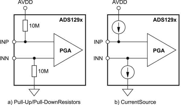 - Detekcja w trybie DC – realizowana w najprostszy możliwy sposób poprzez podłączenie wewnętrznych rezystorów o dużej wartości, podciągających wejścia wzmacniacza pomiarowego do przeciwnych potencjałów zasilania (AVDD oraz AVSS – rysunek 9). Jeżeli kontakt z ciałem pacjenta zostanie utracony bądź wyraźnie pogorszony, przetwornik ADC zareaguje nasyceniem i umożliwi detekcję stanu awarii poprzez programowe sprawdzenie wartości wyjściowej. Alternatywą jest zastosowanie wbudowanych komparatorów cyfrowych, odczytywanych za pośrednictwem bitów sygnalizacyjnych w rejestrach komunikacyjnych AFE. W niektórych układach istnieje możliwość użycia zestawu dwóch źródeł mikroprądowych zamiast stałych rezystancji.