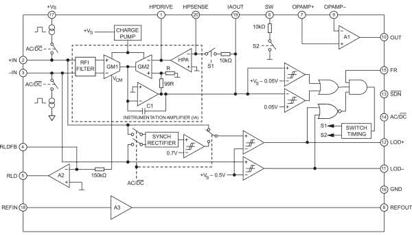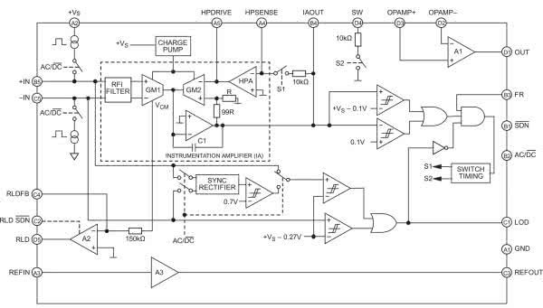 Największą różnicą, która rzuca się w oczy po pierwszym spojrzeniu na schematy blokowe tych układów (rysunki 1 i 2), jest brak… przetwornika ADC. Oba produkty są bowiem w istocie specjalizowanymi wzmacniaczami pomiarowymi, przestrajanymi za pomocą zaledwie kilku wejść cyfrowych i obudowanymi kilkoma dodatkowymi blokami: RLD, układem detekcji impulsów rozrusznika oraz… uniwersalnym wzmacniaczem operacyjnym do dowolnego wykorzystania przez użytkownika.