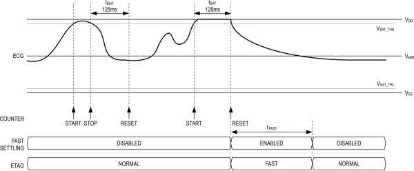 Podobnie jak w przypadku omówionych wcześniej układów AD8232 i AD8233, także front-end MAX30003 zawiera sprzętowe wsparcie dla przyspieszania powrotu izolinii po wystąpieniu silnych zakłóceń (artefaktów ruchowych, impulsów z urządzeń elektrochirurgicznych bądź defibrylatora). Zasadę działania tej funkcji przedstawiono na rysunku 5 – wejście wzmacniacza PGA w stan saturacji uruchamia timer sprzętowy o okresie przepełnienia równym 125 ms. Jeżeli sygnał nie wróci przez ten czas do poprawnego zakresu, częstotliwość progowa filtra górnoprzepustowego jest tymczasowo podwyższana, dzięki czemu napięcie szybciej powraca do właściwego zakresu. Użytkownik może także programowo wymusić zadziałanie funkcji fast recovery w razie potrzeby.