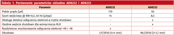 Pomiędzy wersjami AD8232 i AD8233 istnieje jednak kilka zasadniczych różnic, zestawionych w tabeli 1.