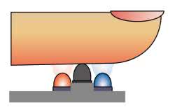 Natomiast w konfiguracji refleksyjnej, pokazanej na rysunku 3, obydwa elementy znajdują się w tej samej obudowie, zaś światło z nadajnika jest rozpraszane i częściowo odbijane przez kolejne warstwy tkanek, dzięki czemu powraca do fotodetektora znajdującego się obok diody LED.
