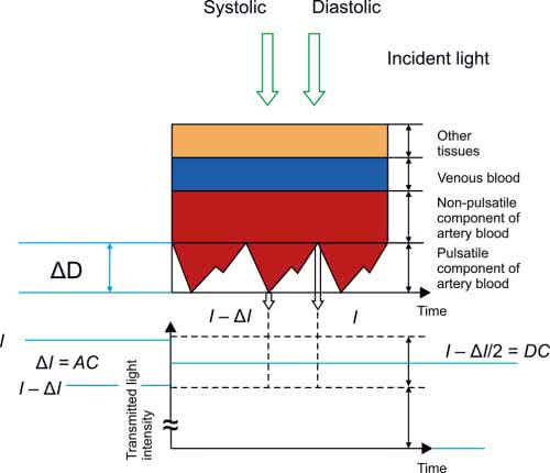 Charakterystyki optyczne tkanek zależą od gęstości ich struktury komórkowej, a także procentowej zawartości określonych substancji chemicznych (np. pigmentów), składu płynów ustrojowych etc. Wspomniane czynniki są jednak w zdecydowanej większości stałe lub wolnozmienne (przynajmniej w obrębie danego organizmu, gdyż, ak zawsze w bioinżynierii, ulegają zmienności osobniczej). Dlatego też najsilniejszym czynnikiem relatywnie szybkozmiennym jest na tym tle przepływ krwi w naczyniach skórnych – mniejszych tętnicach, tętniczkach i częściowo w naczyniach włosowatych. Rytmiczne skurcze lewej komory serca, powodujące wtłaczanie porcji krwi w każdym cyklu pracy (porcja ta jest nazywana objętością wyrzutową) do aorty i dalej do coraz mniejszych naczyń krwionośnych, zostają zatem odwzorowane przez niewielkie, ale mierzalne zmiany objętości krwi, znajdującej się w naczyniach skóry.