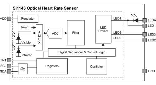 Firma Silicon Labs wprowadziła na rynek prosty układ hybrydowy Si1143-AAGX (schemat funkcjonalny został pokazany na rysunku 7), którego konstrukcja jest najlepszym dowodem wpływu nauk biomedycznych na rozwój elektroniki konsumenckiej. Zamiast klasycznych diod LED w paśmie czerwonym i podczerwonym, w układzie zastosowano bowiem… tylko jedną diodę zieloną.