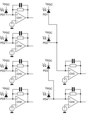 Taka topologia daje sporą elastyczność aplikacyjną, gdyż umożliwia niezależne wykorzystanie każdego z pól czterosegmentowej fotodiody w połączeniu z odpowiadającym jej układem wejściowym (w układach wymagających szerszego zakresu dynamiki), bądź też podłączenie fotodiod parami do ostatnich dwóch kanałów wejściowych (CH3 i CH4), w celu zmniejszenia poziomu szumów podczas pomiaru słabych sygnałów wejściowych. obydwie konfiguracje zostały pokazane na rysunku 9.