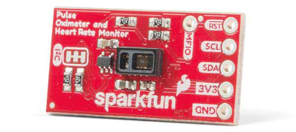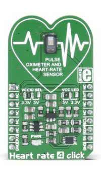 Firma Maxim wprowadziła na rynek także bliźniaczy układ MAX30101, wyposażony w trzy diody LED – zieloną, podczerwoną oraz czerwoną. Dla obydwu modeli dostępne są liczne moduły ewaluacyjne, zarówno uniwersalne (wyposażone w niezbędne obwody zasilania i rezystory podciągające dla szyny I2C), jak i kompatybilne z własnościowymi standardami takimi, jak mikroBUS marki MikroElektronika (fotografia 4) czy też Qwiic marki SparkFun (fotografia 5).