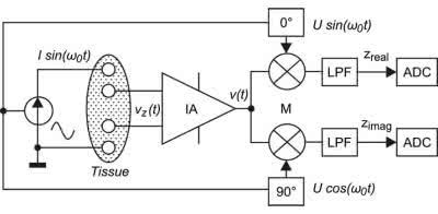 - Przekroczenie zakresu pomiarowego – w przypadku zastosowania pobudzenia prądowego w układzie pozbawionym kontroli rzeczywistego natężenia prądu, istnieje ryzyko przekroczenia zakresu pomiaru – jeżeli suma impedancji mierzonej oraz impedancji połączeń będzie zbyt wysoka, układ zasilania straci charakterystykę źródła prądowego, przechodząc do trybu stałego napięcia. Aby uniknąć takiego problemu, można rzecz jasna zastosować dodatkowy kanał pomiaru napięcia, monitorujący wyjście źródła prądowego. Analogiczne ograniczenie istnieje w przypadku zastosowania źródła napięciowego o relatywnie dużej (w stosunku do obiektów mierzonych) impedancji wewnętrznej, jednak w typowych pomiarach biomedycznych będzie to sytuacja mało prawdopodobna;