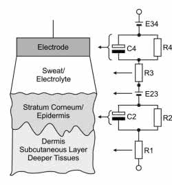 Galwaniczne połączenie elektrody ze skórą tworzy interfejs o dość złożonej charakterystyce (rysunek 4), zależnej nie tylko od częstotliwości, przy której dokonywany jest pomiar, ale także od szeregu czynników fizjologicznych względnie stałych (np. grubości tkanki tłuszczowej czy poziomu nawilżenia skóry) oraz silnie zmiennych (np. pobudzenia psychicznego i temperatury, wpływających na aktywność gruczołów potowych).