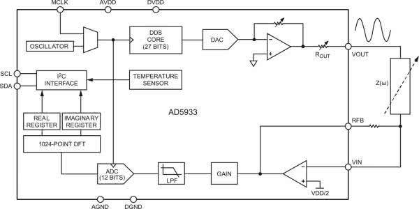 Schemat funkcjonalny układu AD5933 został pokazany na rysunku 5. Front-end bazuje na topologii dwuprzewodowej (i już tutaj ujawnia się jedna z jego największych wad), przy czym pobudzenie ma charakter napięciowy, zaś właściwym parametrem mierzonym jest natężenie prądu. Układ zasilania obiektu badanego bazuje na 27-bitowym rdzeniu DDS z dedykowanym przetwornikiem DAC. Wyjście tego ostatniego jest natomiast podłączone do bufora w postaci przestrajalnego wzmacniacza, pracującego w konfiguracji odwracającej. Na wyjściu układu znajduje się (ustawiany za pomocą rejestrów cyfrowych) rezystor szeregowy ROUT.