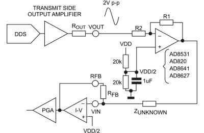 Większość wskazanych powyżej problemów można wydatnie zredukować, korzystając z układu pomiarowego według rysunku 1c, przy zastosowaniu topologii Kelvina i przetwornika ADC o wysokiej rozdzielczości, wyposażonego w opcjonalny wzmacniacz PGA. O ile jednak sam pomiar amplitudy napięcia i prądu (umożliwiający wyliczenie impedancji) jest wystarczający w niektórych zastosowaniach, to zwykle od testów (bio)impedancyjnych wymaga się także określenia charakterystyki częstotliwościowej oraz fazowej.