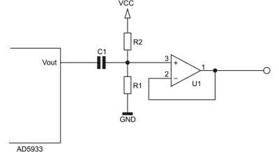 - offset napięcia wyjściowego – jednym z podstawowych warunków bezpieczeństwa elektrycznego i zarazem poprawności metrologicznej w pomiarach (bio)impedancyjnych jest zapewnienie zerowej wartości średniej sygnału zasilającego próbkę. Innymi słowy, generator przebiegu pobudzającego nie powinien wprowadzać składowej stałej do przebiegu wyjściowego. W przypadku AD5933 warunek ten nie jest spełniony i co gorsza, wartość składowej stałej napięcia generowanego pomiędzy wyjściem VOUT, a wejściem wzmacniacza transimpedancyjnego (TIA), zmienia się w zależności od wyboru zakresu pracy – przy stałym napięciu odniesienia dla TIA (równym połowie napięcia zasilającego), offset generatora zmienia się w dość szerokim zakresie. Problem ten można zniwelować, dodając wtórnik napięcia o wejściu spolaryzowanym dzielnikiem napięcia i sprzężony z linią VOUT zmiennoprądowo (przez szeregowy kondensator – rysunek 7). Taka prosta modyfikacja wprowadza jednak kolejne ograniczenie – aby móc uzyskać szerokie pasmo pomiarowe (obejmujące także najniższe częstotliwości), należałoby zastosować układ C1, R1, R2 o dużej stałej czasowej, a to prowadziłoby do niepożądanych opóźnień w ustalaniu offsetu (długi czas ustalania, czyli tzw. settling time). W jednej z publikacji naukowców z Politechniki Wrocławskiej można znaleźć interesujący, choć znacznie bardziej rozbudowany układ pomiarowy, wykorzystujący uśrednianie sygnału z dwóch detektorów szczytowych do szybkiego ustalania offsetu przy dowolnie małej częstotliwości [3];