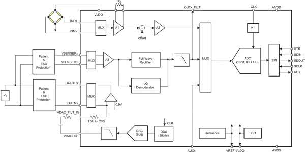 Firma Texas Instruments wprowadziła na rynek układ AFE4300, integrujący dwa bloki funkcjonalne – 4-elektrodowy miernik impedancji oraz kanał pomiarowy do obsługi mostka tensometrycznego. Przeznaczeniem układu są wagi łazienkowe (i inne urządzenia biomedyczne), wyposażone w funkcję spektroskopowej analizy składu ciała. Schemat blokowy układu pokazano na rysunku 8.