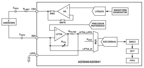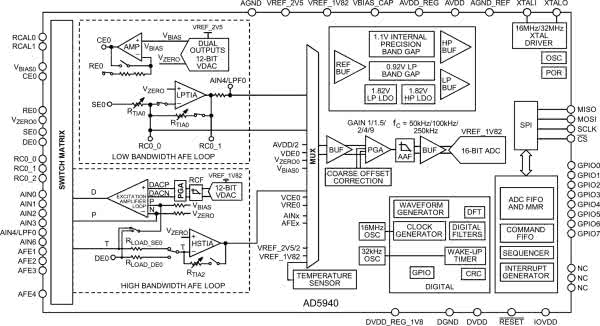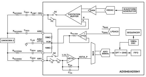 Rozbudowane układy AD5940 i AD5941 firmy Analog Devices są przeznaczone nie tylko do badań impedancyjnych, ale także do współpracy z czujnikami elektrochemicznymi lub innymi źródłami sygnałów prądowych bądź napięciowych. Schematy blokowe obu układów zostały pokazane na rysunkach 1 i 2.