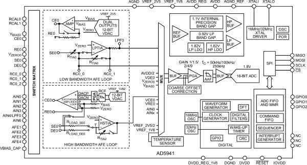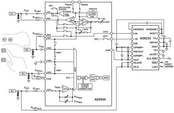 - Tor wzmacniacza EKG – układ umożliwia rejestrację jednoodprowadzeniowego (bipolarnego) EKG z osobną elektrodą RLD, przy czym linie sygnałowe EKG są multipleksowane różnicowo na czterech z ośmiu wejść toru bioimpedancyjnego – użytkownik ma także możliwość wyboru linii, wykorzystywanych jako źródło sygnałów dla sumatora wzmacniacza RLD. Co ciekawe, producent zdecydował się zastosować osobne bloki detekcji odłączenia elektrod (lead-off) dla torów EKG (tryby DC lub AC o amplitudzie od 1,6 nA do 100 nA) i bioimpedancji. Za właściwą akwizycję biosygnałów odpowiada wysokiej jakości wzmacniacz pomiarowy o wzmocnieniu 2…21 V/V, współczynniku CMRR powyżej 100 dB, impedancji wejściowej przekraczającej 1 GΩ oraz poziomie szumu odniesionym do wejścia 0,75 μVrms (w paśmie do 150 Hz). Wzmacniacz jest w stanie pracować z offsetem współbieżnym do ±0,3 V i różnicowym do ±0,6 V (jest to zakres wystarczający w większości praktycznych aplikacji EKG, wykorzystujących elektrody żelowe). Usuwanie dryfu izolinii zapewnia układ filtra górnoprzepustowego (współpracującego z zewnętrznym kondensatorem) o częstotliwości progowej 0,4 Hz i funkcją szybkiego powrotu ze stanu nasycenia. Dodatkowo, na wyjściu wzmacniacza pomiarowego znajduje się 300-hercowy filtr dolnoprzepustowy, pełniący funkcję filtru antyaliasingowego.