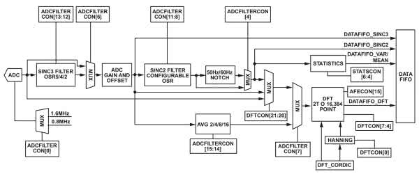 Sam przetwornik – stanowiący serce całego front-endu – jest wyposażony w blok kondycjonowania sygnałów, złożony z bufora różnicowego, wzmacniacza PGA oraz filtru antyaliasingowego. Jakby tego było mało, na wyjściu przetwornika znalazł się rozbudowany podsystem postprocessingu (rysunek 3), który oprócz licznych filtrów SINC, układów korekcji offsetu i wzmocnienia oraz bloku uśredniania próbek, zawiera także… procesor statystyczny, oferujący sprzętowe wsparcie do wyliczania wariancji i wartości średniej oraz wykrywania nieprawidłowych odchyleń statystycznych – detektor anomalii zgłasza przerwanie po wykryciu wyniku pomiaru podejrzanie odstającego od reszty (!). Imponująca jest także długość wbudowanej pamięci FIFO (6 kB – całkiem sporo w porównaniu z większością układów AFE) oraz wektora DFT (od 2 do 16384 punktów!).