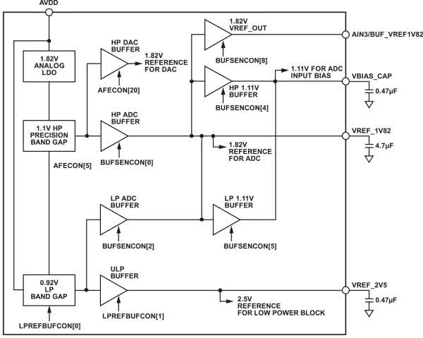 Co ciekawe, front-endy AD5940/1 mają aż dwa wbudowane źródła napięcia odniesienia o wartościach nominalnych 1,1 V (źródło precyzyjne) oraz 0,92 V (źródło o obniżonym poborze mocy), a także LDO o napięciu wyjściowym 1,82 V. Całość uzupełniają liczne, konfigurowalne bufory, zoptymalizowane pod kątem niskiego poboru mocy lub wysokiej wydajności (co oznacza zdolność do pracy przy wysokich częstotliwościach sygnałów). Schemat bloku źródeł napięć odniesienia pokazano na rysunku 4.