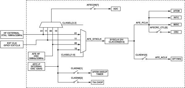 W prezentowanych AFE nie zabrakło też rozbudowanego bloku taktowania, wspierającego zewnętrzne oscylatory kwarcowe o częstotliwości do 32 MHz i wyposażonego we wbudowane generatory 16/32 MHz, 32 kHz oraz zestaw przełączników i preskaler (rysunek 5).