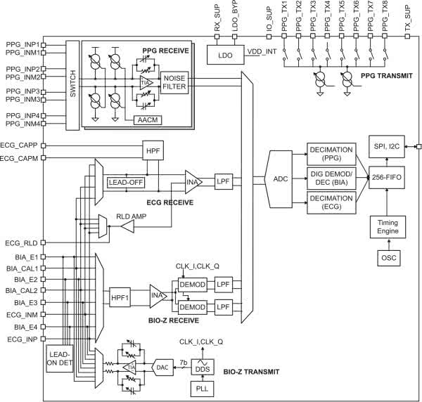 - Tor pomiarów optycznych (PPG) – układ zawiera konfigurowalny sterownik diod LED, wykorzystujący blok źródeł prądowych (zakres ustawień od 25 do 250 mA z rozdzielczością 8 bitów) i przełączników, pozwalających na sterowanie maksymalnie ośmioma diodami LED w konfiguracji wspólnej anody. Użytkownik może ustawić czasy włączenia diod w każdej fazie cyklu pracy, a dodatkowo istnieje opcja uruchomienia każdego z kilku sensorów z inną częstotliwością próbkowania. Blok odbiorczy wspiera podłączenie nawet do czterech niezależnych fotodiod, multipleksowanych za pomocą przełącznika analogowego na dwa wspólne tory pomiarowe, z których każdy zawiera przestrajalny, różnicowy wzmacniacz transimpedancyjny (rezystancja sprzężenia zwrotnego w zakresie od 3,7 kΩ do 1000 kΩ), filtr szumu i układ redukcji wpływu oświetlenia zewnętrznego, oparty na 8-bitowym przetworniku DAC z wyjściem prądowym o zakresie 16..256 μA, Układ wspiera tryb niskiego poboru mocy, umożliwiający pracę niewielkich urządzeń akumulatorowych/bateryjnych w trybie ciągłym.