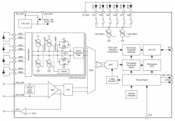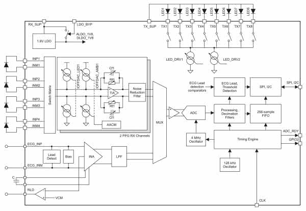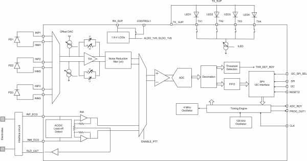 Znane z opisanych wcześniej front-endów rozwiązania to m.in. wielokanałowy sterownik diod LED (w tym przypadku: 4-kanałowy), oraz front-end ze wzmacniaczem TIA i układem redukcji wpływu otoczenia (multiplekser różnicowy dla trzech fotodiod). Podobna jest także topologia głównego bloku peryferyjnego – przetwornik ADC, poprzedzony wspólnym dla wszystkich źródeł sygnału buforem, współpracuje z decymatorem i kolejką FIFO (128 próbek).