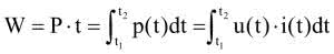 Energia elektryczna W, pobrana przez dany odbiornik o mocy czynnej P w określonym przedziale czasowym t, lub – ujmując sprawę nieco ogólniej – przez odbiornik o mocy chwilowej p(t) w czasie od t1 do t2 – jest zdefiniowana wzorem (3):