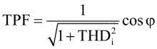 Z powodu złożonego charakteru strat związanych z harmonicznymi prądu, w praktyce przy określaniu współczynnika mocy wykorzystuje się dodatkowy czynnik, który – pomnożony przez cosinus kąta fazowego – umożliwia pełniejsze zobrazowanie poziomu strat w systemie. Ów czynnik bazuje na wartości poziomu zniekształceń harmonicznych (THD) – wynikowe równanie pozwalające na obliczenie „praktycznego” współczynnika mocy (TPF – true power factor) ma postać (6):