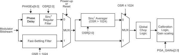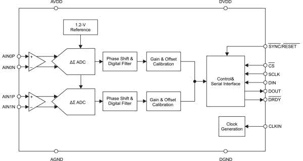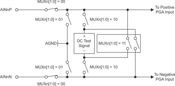 Schemat blokowy najmniejszego, dwukanałowego układu z omawianej rodziny ADS131M02 – pokazano na rysunku 11. Dwa różnicowe wzmacniacze PGA o wzmocnieniu 1, 2, 4, 8, 16, 32, 64 lub 128 V/V i poziomie szumu od 0,42 μVrms (250 Sps, 128 V/V) do 75,34 μVrms (64 kSps, 1 V/V) pełnią funkcję buforów dla 24-bitowych przetworników delta-sigma. Każdy z kanałów ma filtr cyfrowy, cyfrowo przestrajany przesuwnik fazy oraz blok kalibracji wzmocnienia i offsetu napięciowego. Przed wzmacniaczami znajdują się (niepokazane na schemacie) multipleksery, umożliwiające – oprócz połączenia z odpowiadającymi im wejściami PGA – zwarcie wejść do masy lub podanie sygnału testowego (DC) w dowolnie wybranej polaryzacji (rysunek 12).
