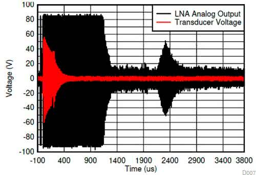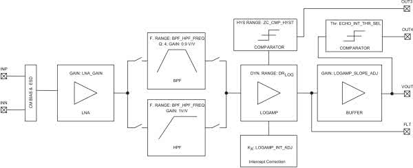 Tor kondycjonowania sygnałów echa (rysunek 6) ma swój początek w postaci wzmacniacza niskoszumnego (LNA) o wzmocnieniu regulowanym cyfrowo w sekwencji 10/12,5/15/20 V/V, za którym znajduje się filtr BPF o wzmocnieniu w paśmie przepustowym równym 0,9 V/V. Charakterystykę filtru w dość szerokim zakresie kształtuje kilka pól bitowych, zawartych w rejestrach BPF_CONFIG_1 i BPF_CONFIG_2: dobroć można ustawić na wartość 2, 3, 4 lub 5, zaś częstotliwość środkową ustala się za pomocą sześciu najmłodszych bitów BPF_HPF_FREQ rejestru BPF_CONFIG_1. Front-end umożliwia wprowadzenie niewielkiego przesunięcia częstotliwości środkowej względem ustawień dokonanych za pomocą BPF_HPF_FREQ, co dodatkowo rozszerza zakres strojenia. Istnieje także możliwość wyłączenia funkcji BPF i wykorzystania bloku prostego filtru górnoprzepustowego (HPF) o częstotliwości granicznej 50, 100, 200 lub 400 kHz i wzmocnieniu w paśmie przepustowym 1 V/V.
