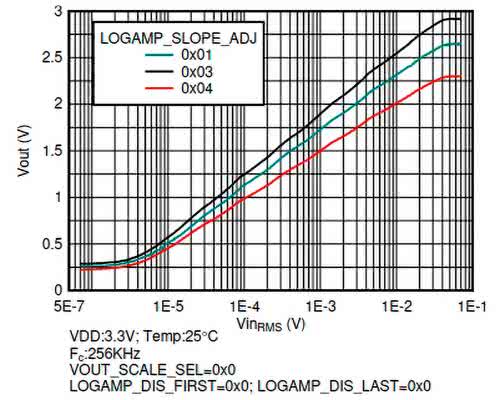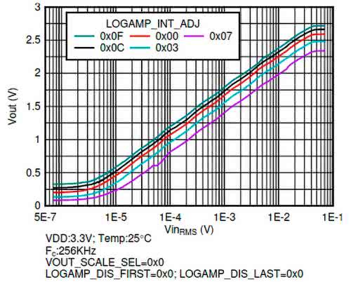 Co ciekawe, do dyspozycji użytkownika jest także kilka dodatkowych ustawień wzmacniacza logarytmicznego. Pole bitowe LOGAMP_SLOPE_ADJ umożliwia modyfikację nachylenia charakterystyki przejściowej przy zachowaniu (w przybliżeniu) tego samego poziomu napięcia początkowego. Z kolei bity LOGAMP_INT_ADJ pozwalają na przesunięcie całej charakterystyki – stosowne wykresy zaprezentowano na rysunkach 9 i 10.