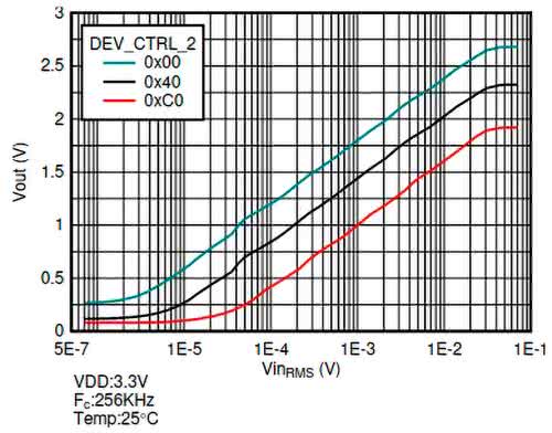 Niezwykle użyteczną funkcją jest skalowanie napięcia wyjściowego, zrealizowane za pomocą bitu VOUT_SCALE_SEL znajdującego się w rejestrze DEV_CTRL_2. Ustawienie logicznego zera mapuje zakres VOUT na zakres do 3,3 V, zaś logiczna jedynka wymusza przeskalowanie do 5,0 V. Takie rozwiązanie znakomicie ułatwia dopasowanie układu do zewnętrznego przetwornika ADC, zwalniając konstruktora z konieczności stosowania dodatkowego wzmacniacza lub tłumika sygnałowego.