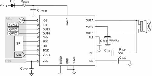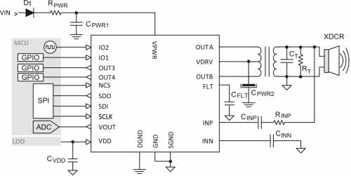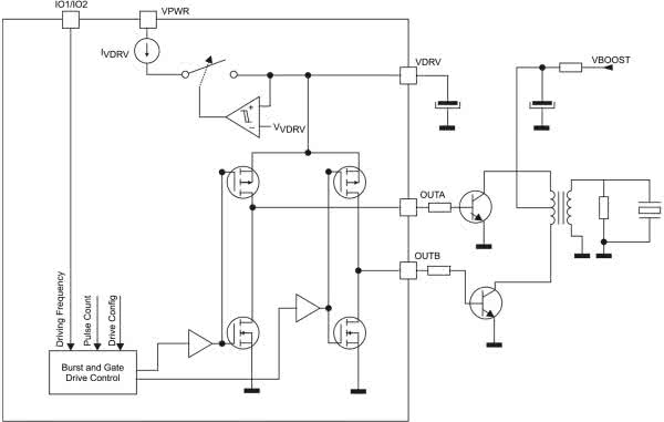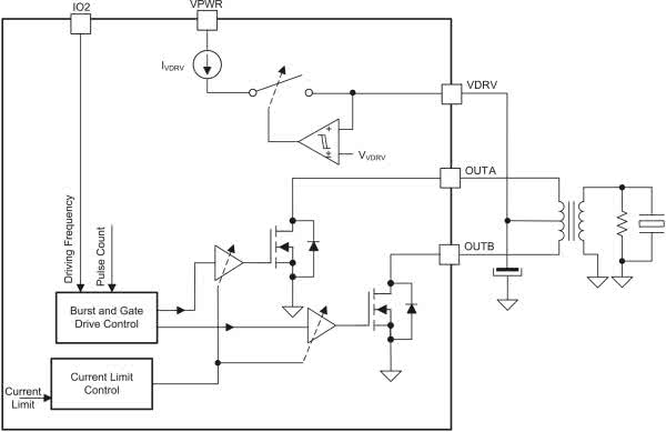 Stopień wyjściowy (rysunek 11) został zrealizowany za pomocą dwóch tranzystorów FET w topologii low-side (otwarty dren), współpracujących z cyfrowo przestrajanym źródłem prądowym. Środkowy odczep uzwojenia pierwotnego transformatora należy podłączyć do linii VDRV, wraz z kondensatorem pełniącym rolę zasobnika energii. Kondensator ten jest ładowany cyklicznie przez wbudowane źródło prądowe, zasilane z napięcia podłączonego do pinu VPWR, zaś proces ładowania jest sterowany przez wewnętrzny kontroler według wartości bitów VDRV_VOLTAGE_LEVEL (poziom napięcia), VDRV_CURRENT_LEVEL (natężenie prądu) oraz VDRV_HI_Z (zezwolenie na działanie układu regulatora). Takie dość nietypowe rozwiązanie umożliwia bardzo prostą konwersję napięcia zasilania „w dół”, bez konieczności stosowania przetwornicy DC/DC lub nieefektywnego stabilizatora liniowego, a dodatkowo – zabezpiecza wyjścia OUTA/OUTB przed przeciążeniem, które mogłoby mieć miejsce w niektórych niekorzystnych konfiguracjach układowych.