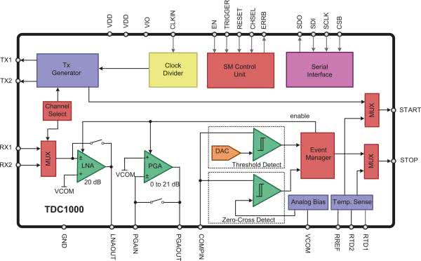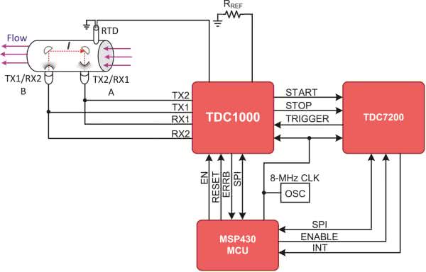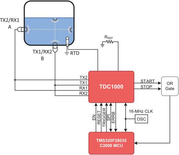 TDC1000 jest front-endem dwukanałowym – wspiera podłączenie dwóch par przetworników RX/TX lub jednej pary przetworników dwufunkcyjnych. Co więcej – zdublowane są nawet wejścia przeznaczone do współpracy z czujnikami temperatury typu RTD (termorezystorami PT1000 lub PT500), niezbędnymi do dokładnej kalibracji systemu pomiarowego. Także w tym przypadku mamy do czynienia z układem, który sam w sobie nie realizuje pomiaru czasu przelotu wiązki (TOF – Time Of Flight) – ten etap procedury pomiarowej musi być wykonany przez zewnętrzny mikrokontroler lub FPGA (choć w przypadku aplikacji wymagających najwyższej dokładności oraz rozdzielczości producent zaleca użycie specjalnie do tego celu stworzonego układu TDC7200, pełniącego rolę przetwornika czas-częstotliwość, czyli… bardzo precyzyjnego stopera).
