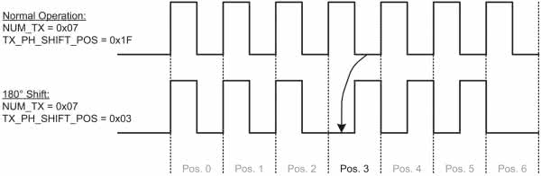 - Przesunięcie fazy – ustawienie pola bitowego TX_PH_SHIFT_POS w rejestrze CONFIG_4 umożliwia wprowadzenie przesunięcia fazy sygnału generowanego na liniach TX1 i/lub TX2 o 180° w ściśle określonym momencie nadawania paczki impulsów (rysunek 25). Według producenta taki zabieg pozwala w niektórych sytuacjach częściowo skrócić czas wyłączania nadajnika. Producent zaleca unikanie ustawienia TX_PH_SHIFT_POS na wartości 0 lub 1 – liczba 31 powoduje natomiast całkowite wyłączenie tej funkcji.