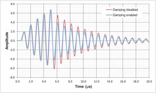 - Tłumienie nadajnika – druga z omawianych funkcji może być włączona za pomocą bitu DAMPING, znajdującego się w rejestrze CONFIG_2. W efekcie ustawienia ww. bitu, nadajnik przedłuży ostatni impuls z paczki nadawczej, co sprawi, że przetwornik – kolokwialnie rzecz ujmując – częściowo „wypadnie z rytmu”, narzuconego przez częstotliwość nadawania, zbliżoną do jego własnej częstotliwości rezonansowej (rysunek 26). Efektem tego pozornie mało znaczącego zabiegu jest natychmiastowy, wyraźny spadek amplitudy drgań gasnących (rysunek 27). Warto dodać, że producent uczciwie przyznaje, iż uruchomienie obu funkcji jednocześnie (przesunięcie fazy i tłumienie nadajnika) może doprowadzić do niewłaściwego zachowania front-endu – podobnie zresztą, jak zastosowanie funkcji damping w przypadku paczek o długości 31 impulsów.