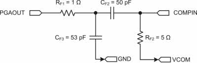 W przypadku układu TDC1000 producent zrezygnował z implementacji wewnętrznych filtrów analogowych oraz wzmacniacza logarytmicznego. Zamiast tego w torze odbiorczym front-endu znalazły się dwa wzmacniacze: LNA (o wzmocnieniu 20 dB) oraz PGA (ustawiany w sekwencji 0-3-6-9-12-15-18-21 dB), przy czym każdy z nich może być wyłączony w razie potrzeby. Co więcej, zamiast bezpośredniego połączenia kaskadowego obu bloków, użytkownik ma do dyspozycji osobne piny zapewniające dostęp do wyjścia LNA (LNAOUT), oraz wejścia i wyjścia PGA (odpowiednio – PGAIN, PGAOUT) oraz wejścia bloku wewnętrznych komparatorów (COMPIN). Takie rozwiązanie daje sporą elastyczność układową, rzecz jasna za cenę zwiększenia liczby komponentów pasywnych. Przykładowo, zalecany przez inżynierów TI filtr pasmowoprzepustowy na wyjściu PGAIN ma postać pokazaną na rysunku 20.