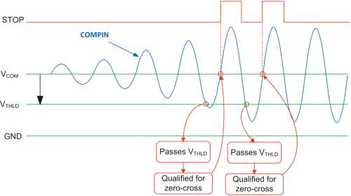 Wyjścia obu komparatorów są skierowane do bloku event manager, bazującego na maszynie stanów i odpowiedzialnego za generowanie sygnałów STOP w zależności od aktualnie wybranego trybu pracy. Po wykryciu przekroczenia przez sygnał wejściowy komparatorów (COMPIN) określonego progu (VTHLD), zaprogramowanego za pomocą przetwornika DAC, maszyna stanów przechodzi w tryb oczekiwania na przejście przez zero – po wystąpieniu takiego stanu natychmiast ustawiany jest stan wysoki na wyjściu STOP (rysunek 21). Rozwiązanie to pozwala zwiększyć dokładność czasową pomiaru, która bezpośrednio przekłada się na minimalizację błędu odczytu właściwej wielkości mierzonej (np. odległości czy też prędkości propagacji ultradźwięków w badanym ośrodku).