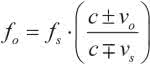 gdzie: fo – częstotliwość odebrana przez obserwatora, fs – częstotliwość fali wysłanej przez źródło, c – prędkość dźwięku w ośrodku, vo – prędkość obserwatora względem ośrodka, vs – prędkość źródła względem ośrodka. Górne znaki w liczniku i mianowniku odnoszą się do sytuacji, w której obserwator i źródło zbliżają się do siebie, zaś dolne – do sytuacji przeciwnej. W przypadku gdy źródło lub obserwator nie poruszają się względem otoczenia, odpowiednią wielkość (vs lub vo) należy przyjąć jako równą zeru. Warto tutaj zwrócić uwagę na fakt, że prędkości vs oraz vo są wyrażone względem otaczającego ośrodka, zatem w przypadkach takiej samej prędkości względnej źródła i obserwatora, ale w różnych konfiguracjach (stacjonarny obserwator lub stacjonarne źródło), wynikowa częstotliwość fo będzie miała nieco inne wartości.