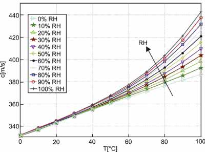 Nieprzypadkowo zwróciliśmy tutaj uwagę na warunki, w których dokonywany jest pomiar – prędkość dźwięku w dużej mierze zależy bowiem od szeregu parametrów ośrodka: w przypadku powietrza szczególne znaczenie mają temperatura i wilgotność, choć istnieją także zależności od składu powietrza (w tym koncentracji CO2) oraz ciśnienia. W normalnych warunkach atmosferycznych (tj. przy ciśnieniu 1013 hPa) zwykle możemy skupić się jedynie na dwóch wymienionych wcześniej parametrach – stosowne wykresy zależności prędkości dźwięku od temperatury i wilgotności zaprezentowano na rysunku 3.