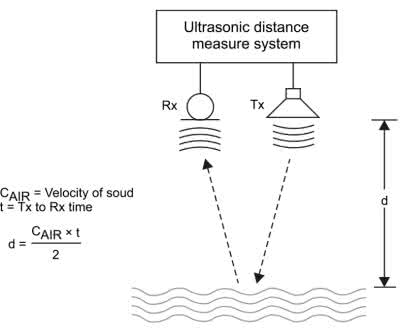 W przypadku pomiaru poziomu cieczy w zbiorniku, przetwornik może być zamontowany w jego dnie – dzięki różnicy impedancji akustycznej, odbicie fali nastąpi po natrafieniu przez ultradźwięki na granicę ośrodków (ciecz-powietrze). Taką konfigurację reprezentuje ustawiony pionowo przetwornik na rysunku 22. Jeżeli natomiast celem pomiaru ma być określenie stężenia substancji w roztworze (czy też jego identyfikacja jako taka) – parametrem niezmiennym powinna być długość drogi przebywanej przez falę, zaś mierzoną niewiadomą – prędkość fali w ośrodku. Do tego celu służy pokazany na rysunku 21 przetwornik skierowany poziomo na przeciwległą ściankę zbiornika;