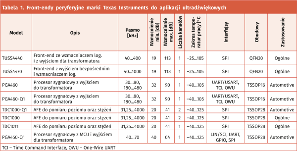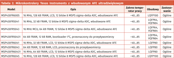 Co ciekawe, pomimo dużej uniwersalności i popularności metod ultradźwiękowych, na rynku dostępnych jest stosunkowo mało specjalizowanych front-endów przeznaczonych do tego typu aplikacji. O ile w tańszych, szeroko rozpowszechnionych urządzeniach (takich jak niedrogie moduły dalmierzy ultradźwiękowych stosowanych np. w robotyce amatorskiej, czy też akcesoryjne zestawy samochodowych czujników parkowania) są zwykle słabo udokumentowane układy scalone ASIC, to dla aplikacji profesjonalnych tego typu rozwiązania zdecydowanie nie będą najlepszym wyborem. Z pomocą przychodzi tutaj firma Texas Instruments, która jako jedyna opracowała dość szerokie portfolio ultradźwiękowych układów AFE, co więcej – znajdziemy wśród nich zarówno układy peryferyjne (tabela 1), jak i specjalistyczne mikrokontrolery z wbudowanym AFE ultradźwiękowym (tabela 2).