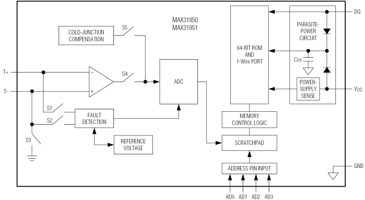 Wspomniany wcześniej, napięciowy charakter sygnału wyjściowego termopary oraz związana z tym możliwość zaoszczędzenia cennych mikroamperów prądu zasilania, zostały w przypadku omawianego układu doskonale wykorzystane. Inżynierowie firmy Maxim zdecydowali się bowiem na zastosowanie interfejsu 1-Wire, który oprócz przesyłu danych z front-endu, obsługuje także zasilanie układu w trybie podkradania energii. Dzięki temu można bez trudu zastosować MAX31856 do budowy zdalnych przetworników temperatury, podłączanych do wspólnego kontrolera za pomocą jedynie dwóch przewodów.