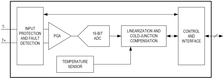 Schemat blokowy front-endu przedstawiono na rysunku 11. Ogólna zasada działania nie odbiega zasadniczo od poprzednio przedstawionych układów AFE – kompensacja zimnych końców termopary jest wykonywana w domenie cyfrowej, na podstawie odczytu z wbudowanego czujnika temperatury podłączonego przez multiplekser do 14-bitowego przetwornika ADC, obsługującego też główny tor pomiarowy. W tym przypadku producent zrezygnował jednak z funkcji linearyzacji, przerzucając odpowiedzialność za korekcję nieliniowości czujnika na oprogramowanie nadrzędnego procesora, pozostawił natomiast obwody do detekcji zwarcia termopary do GND/VDD oraz rozwarcia obwodu pomiarowego.