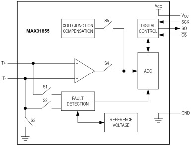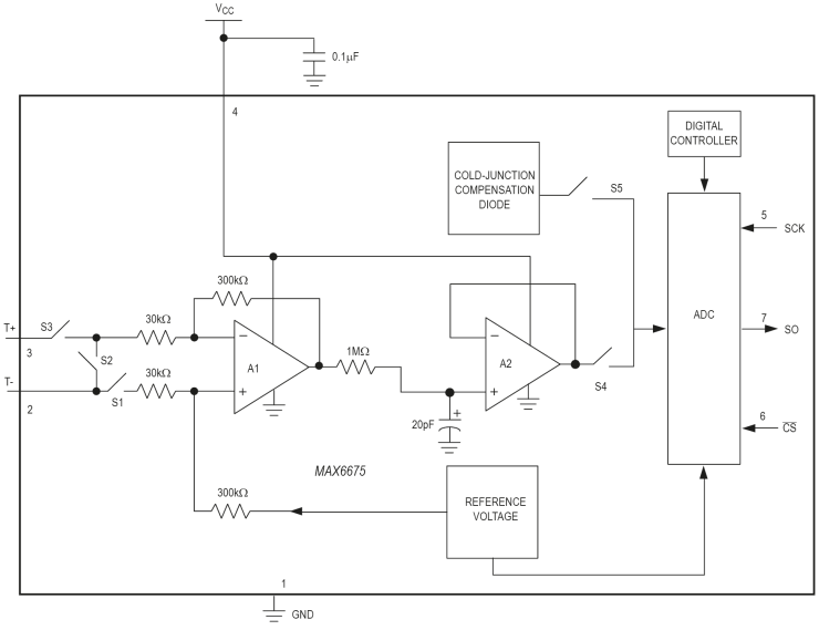 Schemat układu MAX6675 przedstawiono na rysunku 8. Niestety, producent nie podaje zbyt wielu szczegółów na temat obwodów wejściowych z przełącznikami S1...S3, ale można przypuszczać, iż zostały one zastosowane w celu detekcji rozwarcia (uszkodzenia) termopary – taki stan jest sygnalizowany przez jeden z bitów w ramce danych. Układ komunikuje się z procesorem nadrzędnym poprzez jednokierunkowy interfejs SPI. Warto zwrócić uwagę, że zarówno tor pomiarowy termopary (wzmacniacz różnicowy, analogowy filtr dolnoprzepustowy oraz bufor), jak i wbudowany czujnik temperatury, są obsługiwane przez ten sam przetwornik ADC – kompensacja zimnych końców jest tutaj zatem wykonywana na drodze cyfrowej.