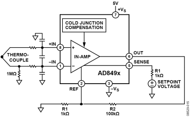 Jeżeli jednak wejście SENSE podłączymy do zewnętrznego źródła napięcia, wzmacniacz wejdzie w tryb komparatora. Dodanie zewnętrznej sieci dodatniego sprzężenia zwrotnego z wykorzystaniem wejścia odniesienia (REF) pozwala wprowadzić histerezę, działającą dokładnie na tej samej zasadzie, jaka ma miejsce w konwencjonalnych komparatorach (choć rzeczywisty układ połączeń – z uwagi na topologię wzmacniacza – jest nieco inny, niż w typowej, książkowej konfiguracji). Schemat takiego prostego termostatu pokazano na rysunku 7.