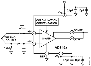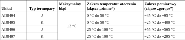 Rodzina termoparowych układów AFE marki Analog Devices obejmuje cztery modele o oznaczeniach AD8494, AD8495, AD8496 oraz AD8497. Wersje z końcówką 4 i 6 są przeznaczone do pracy z termoparami typu J, zaś modele AD8495 oraz AD8497 – z termoparami typu K.