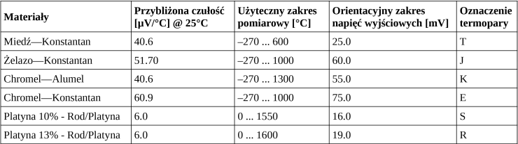 - napięciowy charakter sygnału wyjściowego – termopara nie wymaga zasilania (sama jest źródłem napięcia), co wpływa na ograniczenie poboru mocy urządzenia,