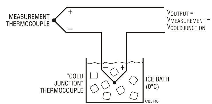 - różnicowy charakter pomiaru – napięcie wyjściowe termopary jest zależne nie od bezwzględnej temperatury gorącej końcówki pomiarowej, ale od różnicy temperatury końcówki gorącej i zimnej (rysunek 1), co wymusza stosowanie elektronicznych technik kompensacji zimnego końca (rysunek 2). I choć użycie lokalnych czujników temperatury pozwoliło z powodzeniem zastąpić popularny kilkadziesiąt lat temu i często spotykany w literaturze układ z jednym końcem termopary umieszczonym w wodzie z lodem (stanowiącej całkiem przyzwoity wzorzec zera dla skali Celsjusza), to do dziś w użyciu pozostaje wypracowana wtedy, choć nieco myląca terminologia końców zimnych i gorących;